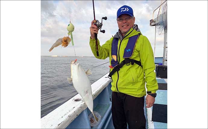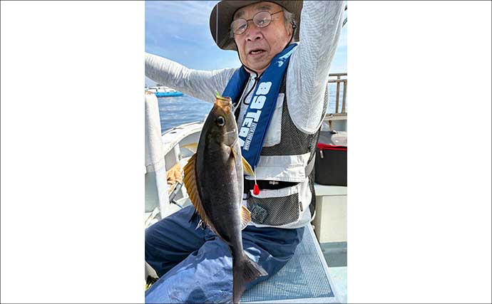 ひとつテンヤマダイは1kg超が揃った。14日2.5kg頭に1kg以上が船中15匹、0~9匹。午後船も出船し、3.4kg頭に0~5匹。ショウサイフグは白子率高く狙い目で13日は23~38cm7~30匹、個体差あるものの大ぶりの白子もあり最高のお土産に。