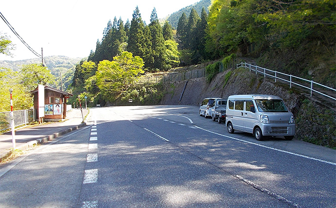 交通の妨げにならないように駐車(提供:TSURINEWSライター・丸山明)そして、川へ降りるのに、階段やスロープがあれば利用がしやすい場所になります。鮎釣りシーズンに川に沿った道路で、駐車している場所をひとつひとつ見ていくと、ここはという場所が見つかります。