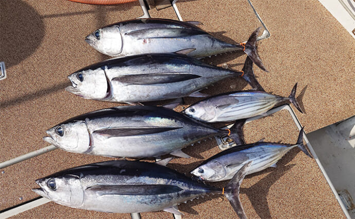 ビンナガをキャッチ(提供:週刊つりニュース中部版APC・山本憲史)本命ではなかったが、長い時間アタリがなかったのでうれしい1匹だ。篠田さんはラインブレイクしてしまったが、次の流しでしっかり仕留めた。船中ビンチョウ4匹、カツオ2匹と厳しい日だったが、まだ始まったばかりのパヤオキハダシーズン。水温が上がれば楽しめることだろう。