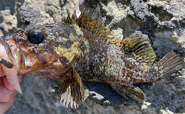その後、アタリも遠のいてきたため、リグをジグヘッドに変更。磯の先端に立ってキャスティングゲームに切り替えることに。すると、小さいながらもキジハタとムラソイを追加できました。