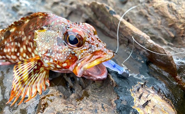 マイクロメタルでカサゴ(提供:TSURINEWSライター・井上海生)ジグ単でいくなら、ダートアクションが中心になる。なるべく先端が尖った矢尻型のヘッドとピンテールのワームを組み合わせて、左右に飛び跳ねるように動かすのだ。ヘッドウェイトは1.5g~3gくらいだろうか。