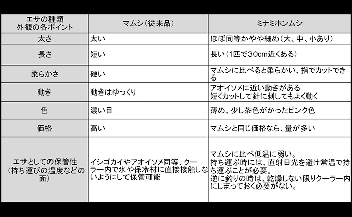エサの比較表(提供:TSURINEWSライター・牧野博)特に注意が必要なのは温度の面で、ミナミホンムシは低温に非常に弱い。私自身も初めて使った時、釣り場移動中に低温のペットボトルと一緒にクーラーに入れて弱らせてしまった。