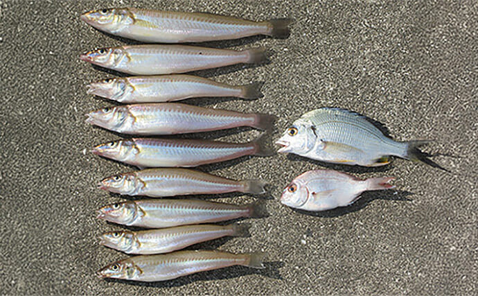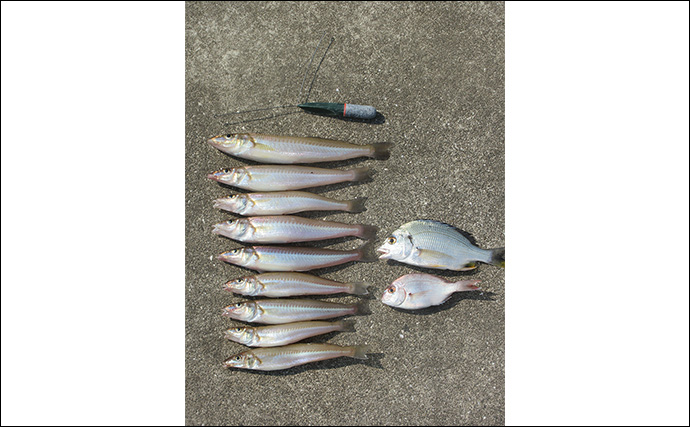 その後は、実釣時間の中で少しずつ移動しながら移動した各ポイントで7~10投ずつ、イシゴカイとミナミホンムシのみで釣り、各々の釣果を別々にビニル袋に入れてクリール内に保管、実釣終了時に釣果の比較を行った。