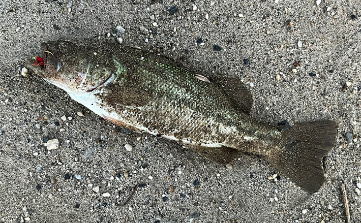 足元付近まで巻くと、突然サビキらしいブルブルッとしたアタリがきた。バスかと思ったが、どうも違う気がする。体は小さいのに、やたら引きが強いのがラインを通じて伝わってくる。とりあえずラインを手繰り寄せてみると……。