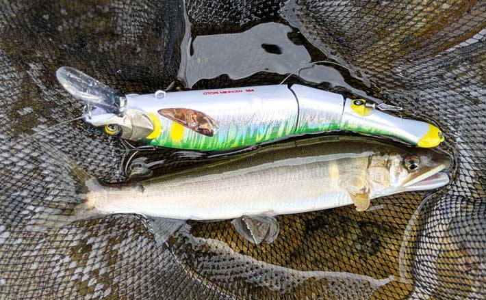 この水量と流れでは少し重すぎると判断し、オトリミノー88に軽い1gシンカーを付けてミノー仕様にして同じポイントへ投げてみました。きれいに泳いで岩の横でステイでき、この軽さがちょうど良い水量でした。