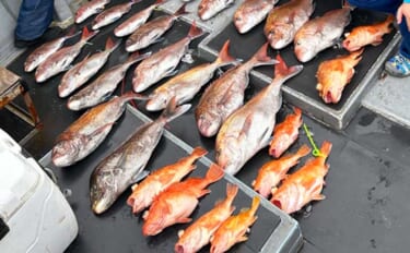 真後ろの人もブリをキャッチ!その後、ミヨシの人にもブリ、胴の間の人はメジロをキャッチしたが、しばらく魚からのお便りはなくなった。