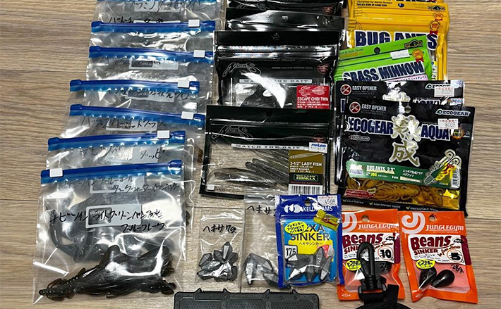 なんというハードスケジュール。さて、肝心のワームは直リグで使用。軽くキャストし、ネチネチと底を攻める。0.8号のオモリなら根掛かりの心配はないはず。浅場付近で小バスかギルあたりが掛かると思いきや……。