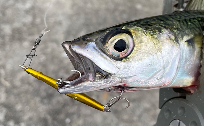 それが、最後の最後に何が起こるかわからないものである。ボトムに着底、ジャーキング、フォールを繰り返していた釣りで、距離的にラストのジャーキングとなった1回で、サバがヒットした。