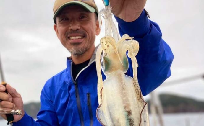 ティップランでゲット(提供:刊つりニュース中部版 桑原一幸)状況次第ではあるが、風が弱く船があまり流れない場合は、再び底を取って一連の釣り方を2~3セット繰り返す。風が強い場合は船が速く流れてラインの角度がついてしまう(水平に近くなる)ため、1セット後アタリがなかったらエギを回収して入れ直す。