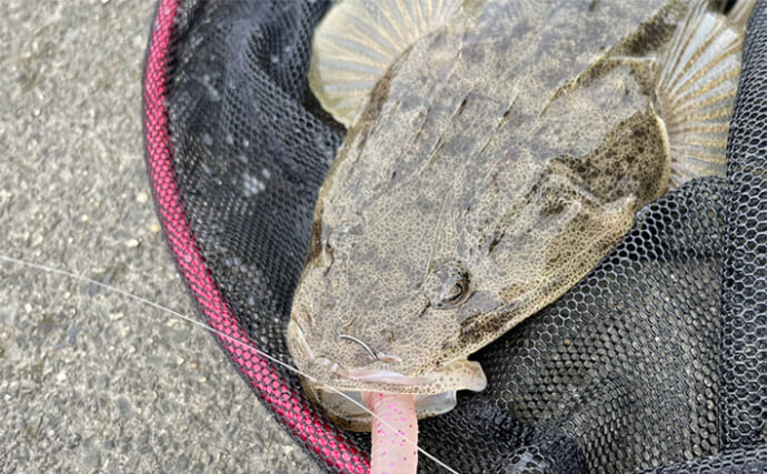 ワームを咥えたマゴチ(提供:TSURINEWSライター・かにおけ)最終釣果