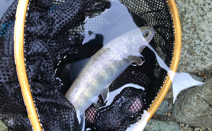とりあえずルアーエリアに入り活性をチェックしてみる。やはり日中は厳しいが、0.4~0.6gのマイクロスプーンを駆使するとポツリポツリと地の魚は釣ることができた。放流まではルアーで狙い小休止。さてテンカラ釣りにチャレンジしてみることとしよう。