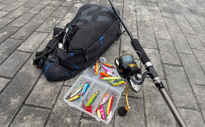 ここではメタルジグの早巻きが有効だ。着水後すぐに巻き始め、表層〜中層をテンポよく引いてくる。ショアジギング専用のペンシルジグやスリムタイプのジグなど、飛距離が出て、素早く巻けるルアーが活躍する。