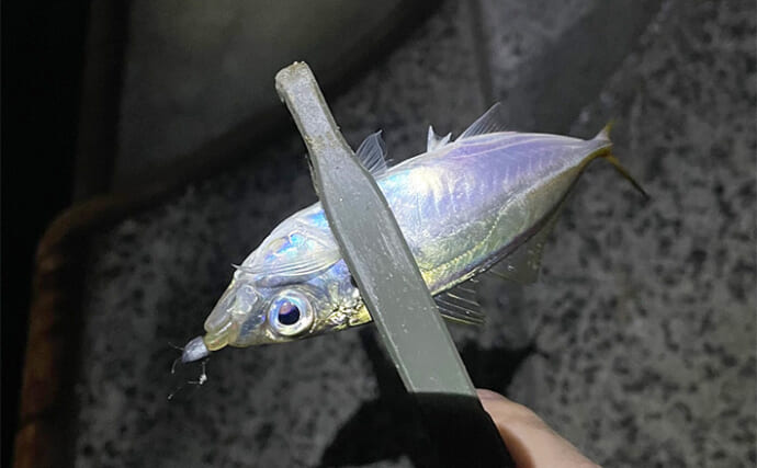 久々の泉南アジング成功(提供:TSURINEWSライター・井上海生)そのあともちょこちょこ突いてくる。だが、何度か手前バラシをやってしまい、多投したこともあって群れがスレてきた。そこで、明暗から微妙に距離をとって、まるで魚から身を隠すような場所からキャスティングで放り込む。漂わせる釣りではなく、すーっとさびくように引いてくると、続けて一尾。