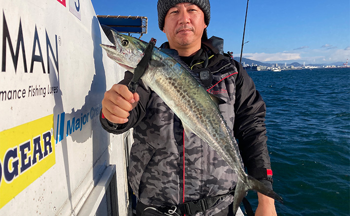 ルアーチェンジ後まもない12時15分、サポーター氏にヒット。よく太ったハマチで、サゴシ主体の南港では貴重な青物となった。
