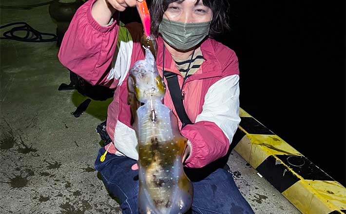 上がってきたのは、まずまずなサイズのアオリイカ!やはり時合いに入っていたのか、周りが釣れだしたタイミングで自分にも来てくれた。ヒットエギは、「エビQ 3号 数釣サクラエビ」。
