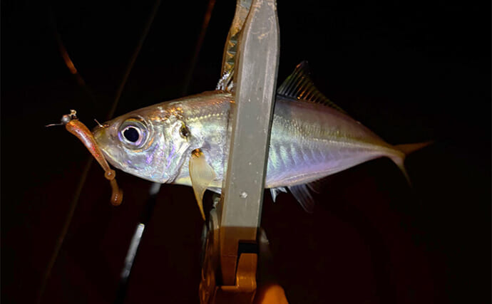 どこを叩いてもアジ(提供:TSURINEWSライター・井上海生)だが、これだけアジが入りに入っていても、常夜灯の周りから離れると少しアタリが遠のいた。要するに、完全にプランクトンパターンなのだ。常夜灯の明かりで増殖する植物性プランクトンにたかってきている。