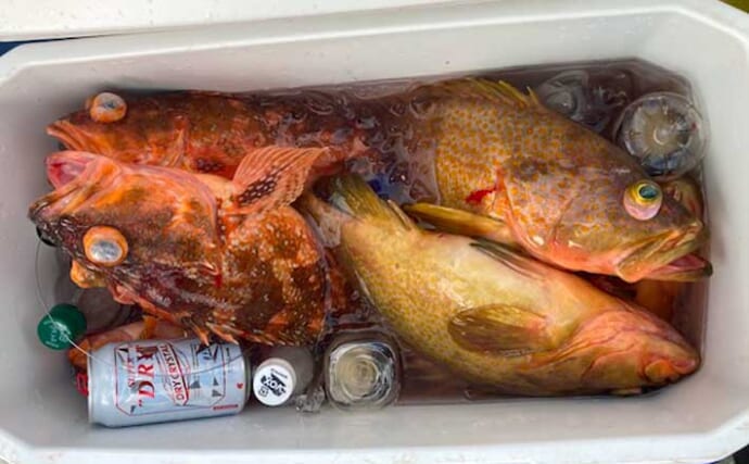 根魚好反応(提供:週刊つりニュース西部版APC・藤井貴之)その後もOさんはスロージギングで良型アコウやボッコなどを連発させている。話を聞くと、130gと軽めのジグを使っているとのこと。潮も風もなく、船は安定していて、その軽さでも十分底は取れる。底からリフト&フォールのスピードが合うのだろう。