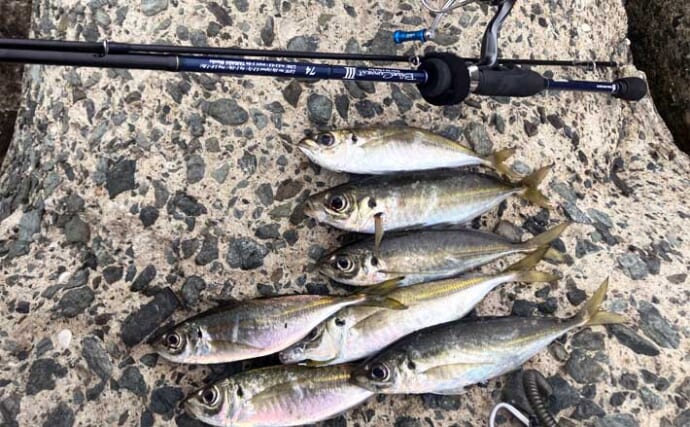 アジの時合いの後、ヒラセイゴが回ってくるかと思ったが、前回から海の様子は変化しており終了。今後、気温とともに水温低下していき厳しくなるが、気軽な地元の海を紹介したい。