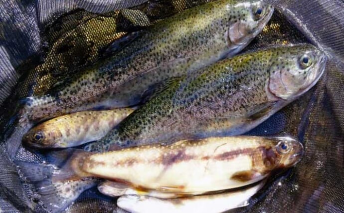 ニジマスヒット(提供:週刊つりニュース中部版APC・伊藤拓摩)さらに白泡の中で一回り大きなニジマスがヒットしたが、ハリス切れでがっかり。これでアタリが止まってしまったので移動する。昼前には青空が見えてきた。