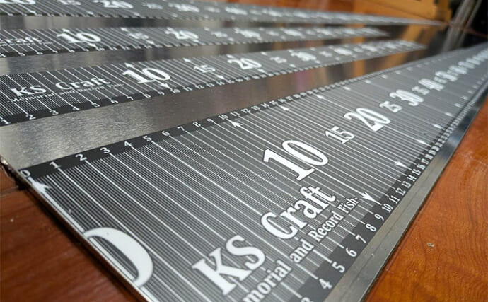 KS Craftのビルダー曽根代表(提供:TSURINEWSライター・黒犬ちこり)『KS Craft(ケイエスクラフト)』は静岡にあるアルミメジャーボード専門メーカー。曽根代表の思いが詰まったアルミメジャーボードは、 アルミの熱伝導率の高さに着目し、夏場の高い外気温でも計測時にメジャーを水にさっと浸けるだけで瞬時に水温や魚の体温に変化するため、魚を火傷させずにスムーズにサイズの計測が可能。