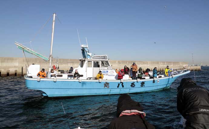 ダブルでヒット(提供:週刊つりニュース関東版・岩下和弘)右舷ミヨシは同宿の古くからの常連の高野明久さん(杉並区)で、良型交えてコンスタントに上げる。隣の高野さんを慕う足立原大治さん(同区)も本命を手中。左舷ミヨシも高野さんの釣り仲間の立花幸作さん(渋谷区)で一荷を披露。