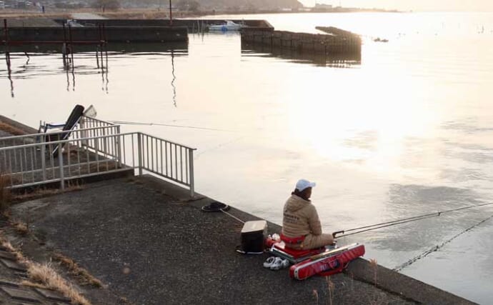 2点目は直近の釣況。昨日釣れたポイントが明日もいい保証はないが、何かしら情報が入っているポイントであれば安心感はある。ところが取材日前日の2月23日は関東で春一番が吹き荒れた。つまりは南っ気の強風。よって出羽屋前を含む霞ヶ浦北岸は大風の大波で全滅。聞いた話では、護岸に当たって砕けた波が堤防壁まで飛んでいたそうだ。