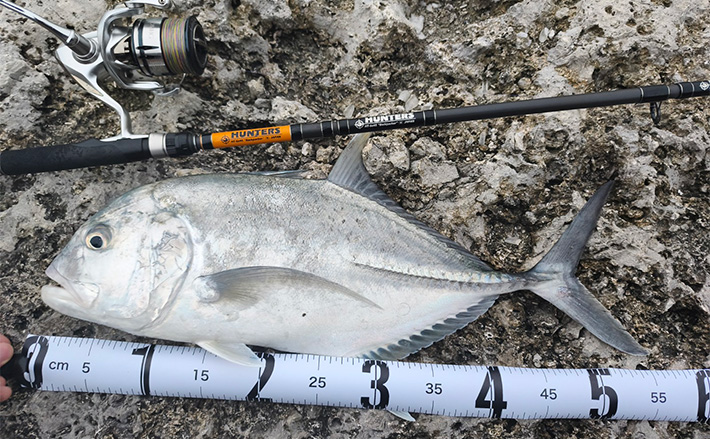 GTことジャイアントトレバリーは、日本ではロウニンアジと呼ばれる大型回遊魚。南方のリーフエリアに生息し、大型個体は体長1m、重量30kgを超えることもある。