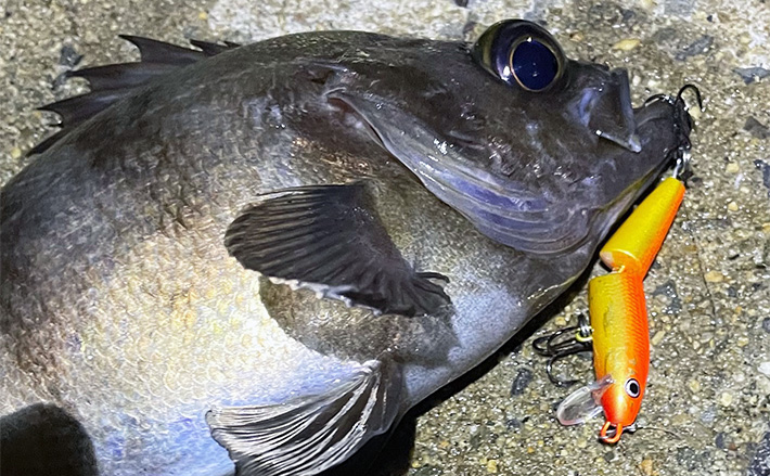 「BIGHIP60」もガンシップに負けず劣らず飛距離抜群だが、漂わせる方向に特化している。潮の中に馴染ませるような使い方がメインとなる。このルアーはもちろんメバルも釣れるのだが、なぜかクロダイに非常に効果がある。