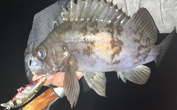 ガンシップでヒット(提供:TSURINEWSライター・檜垣修平)オススメポイントとして、メバル用ルアーの中ではトップクラスの飛距離が出る。そして強めの抵抗感。ルアーがブリブリ泳ぐのが手元に伝わってくるが、これは潮の強弱を捉えやすいということ。