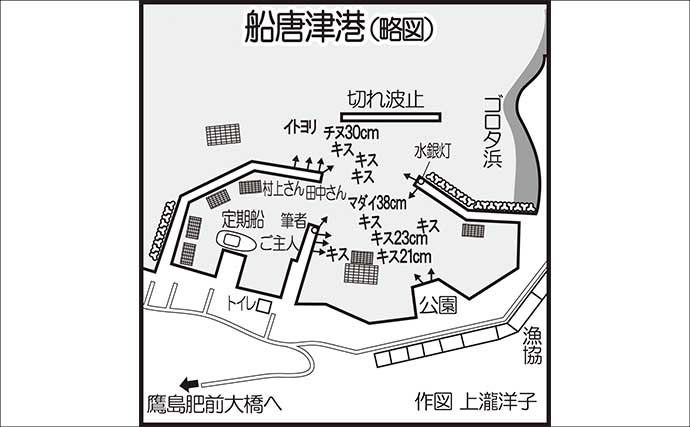 船唐津港(作図:週刊つりニュース西部版・上瀧洋子)マダイ38cmがヒット!