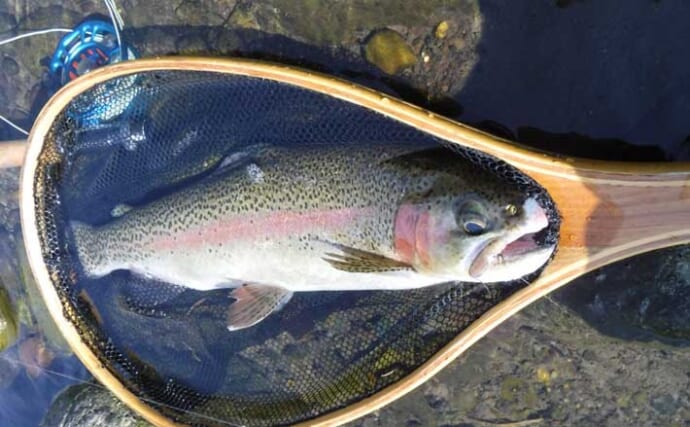 ヤマメ(提供:週刊つりニュース関東版APC・井田泰司)ライズはまだあるので同じようにプレゼントすると、同クラスのヤマメ、尺ヤマメの連続ヒットにニンマリ。さらに25cmクラスのヤマメも追加すると、今度は大型ニジマスがライズを始めた。瀬の脇でライズする40cmクラスのニジマスをキャッチした。