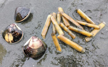 まずはマテ貝が取れる場所について。マテ貝は波が穏やかな内湾の砂泥域を好み、干潟や河口域の浜などに生息します。