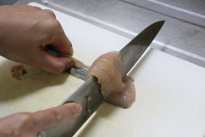 こちらも刺身で食べる場合や、小骨が苦手な人は取っていきましょう。小骨は三枚下ろしにした状態から指の触感と目視で位置を確認し、ていねいに1本1本毛抜きで小骨を抜いていきます。これはかなりの手間なので、どうしても面倒臭い人は、小骨部分を削いでしまうと簡単です。触れば大体の場所は把握できるので、そこの部分を思い切って切り取ると、身は少しもったいないですが、時短になります。