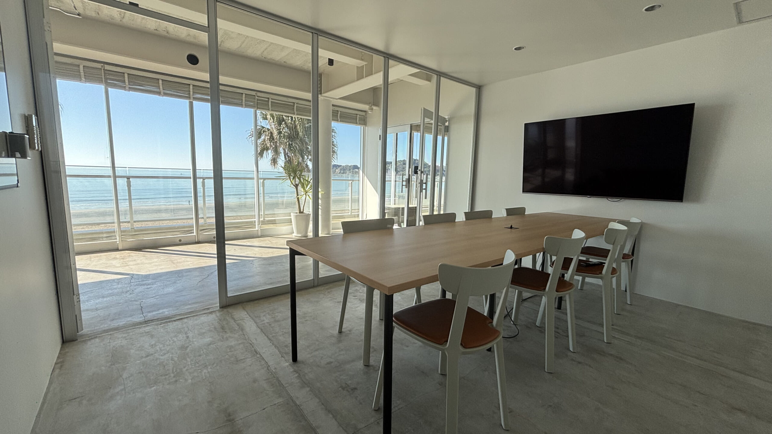国道134号線沿いに「材木座テラス」という複合施設があり、その2階にbluecode株式会社のオフィスがある。一面ガラス張りになっている窓からは材木座海岸がいつでも見え、おしゃれなキッチンや本格的なコーヒーメーカーも完備。海を眺めながら、コーヒーを片手にゆったりとした心持ちで仕事ができるオフィスだ。