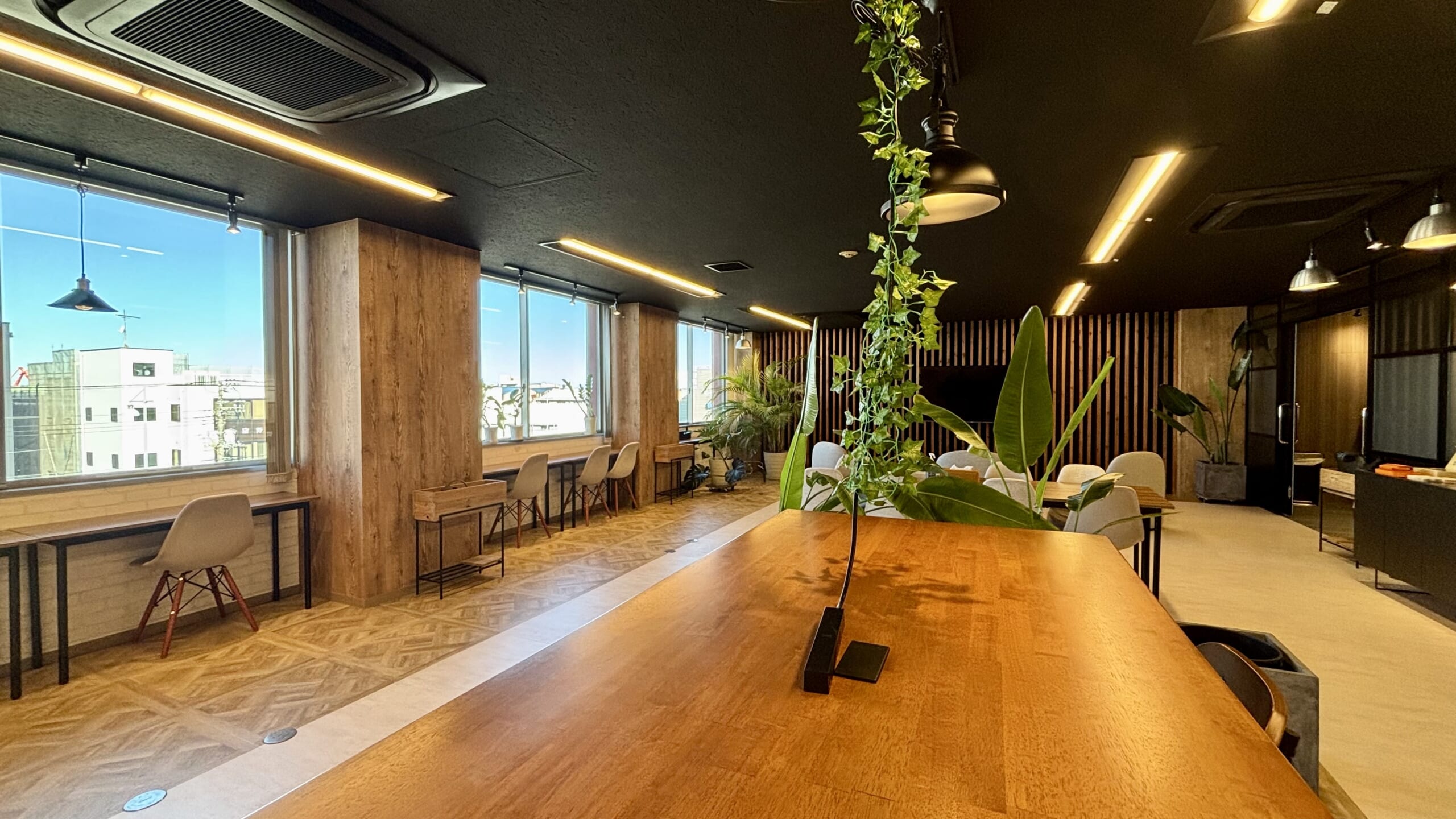 横浜ベイサイド・マリーナのほぼ真横に位置する「マリーナプラザ」4階に、bluecode株式会社の横浜オフィスはある。緑広がるフリーワーキングスペースと、大型モニターが配置されたデスクスペースを完備。横浜ベイサイド・マリーナには会社所有のボートもあり、お昼休憩中にボート釣りをするという離れ業も可能だ。